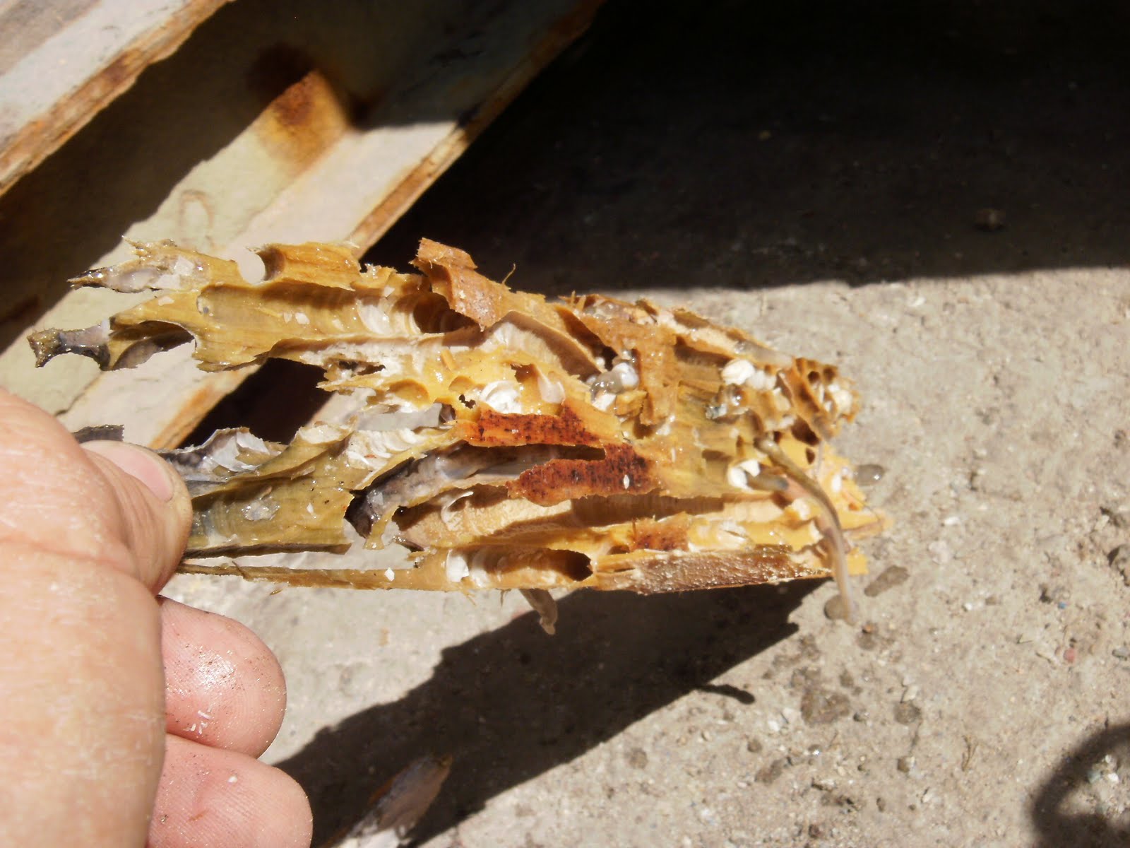as this weeks Friday lunch, itz just a pity that more people weren't here 2 enjoy it. With a big antique bike show this week Big Rob and Richard were absent and Kenny's beloved' waz returning from NZ today so their absence waz noted and accepted(no notes provided).Still it waz a damn tasty meal.Unlike the nasty ,nasty ,nasty critterz you see growing in this bit of mountain ash timber we pulled from the keel of a boat.Big smelly 12inch long wormz YUK!!! They eat your boat while you sleep! itz a good thing they don't like plywood! Galleycat iz made of plywood,foam and fibreglass! Most of which wormz don't like 2 eat.
